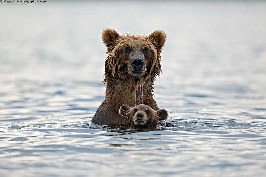 Las madres no sólo cuidan y alimentan, también inculcan buenos hábitos como la hora del baño a la que se somete esta osa junto a su cría.